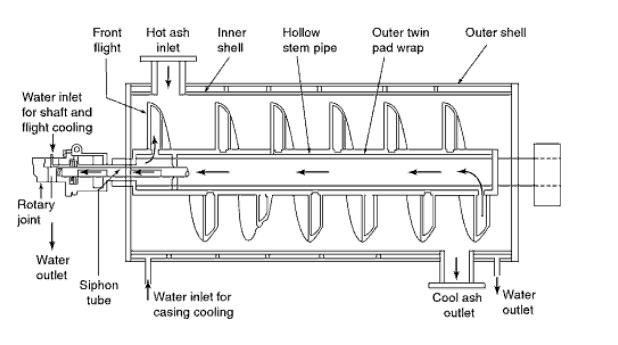 Ash Screw Cooler Water-cooled ash screw cooler shown in figure.1 below, is a good solution for dry ash discharge that is environmentally more more acceptable. Ash from the bed is drained into screw whose flights, shaft and casing are all cooled by softened water of high quality.