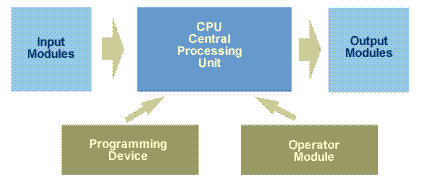 The primary parts of a PLC are the inputs modules, the CPU, and the outputs modules :
