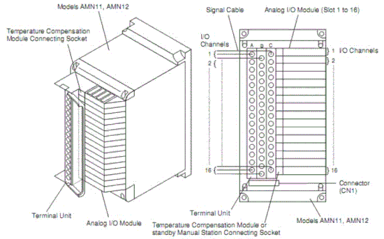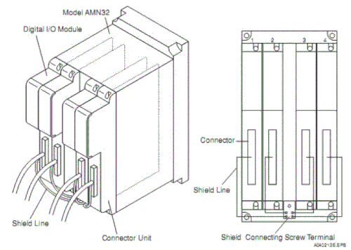 The digital I/O module is configured by the card unit and either the terminal unit or connector unit. It inputs and outputs 16 or 32 signal points and converts signals. Since the types or I/O signals are software-set, no control switch or knob is found on this module.