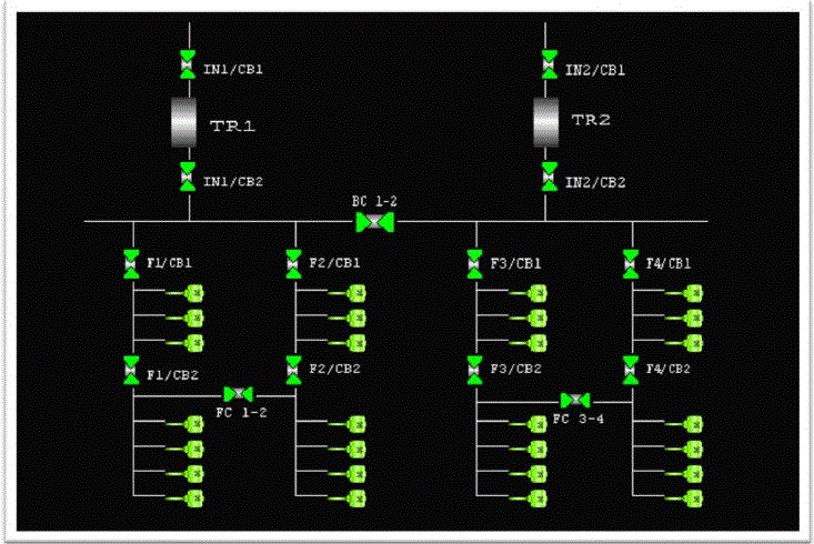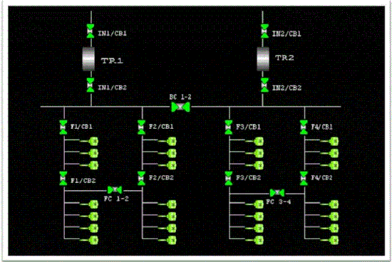 Substation Automation : Visualization of typical substation comprising two incomers and four feeders.