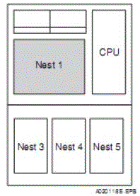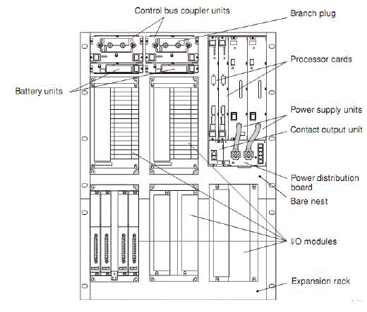 The FCS nest is composed of VL Net couplers, battery units for backing up the CPUs’ main memory, a backboard, a power distribution board, and a ready signal output unit in addition to the CPU cards and power supply card. A FCS model has five I/O modules nest.