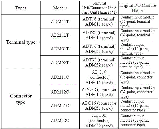 The table below shows the types of digital I/O modules.