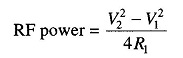 To measure unknown RF power, a small known AF power, indicated by the voltmeter V1, is superimposed on the RF test power. The direct current from voltage E is next adjusted by varying R, which heats the bolometer element until its resistance equals R1, which is the value required to balance the bridge. The test RF power is then turned off, which unbalances the bridge. Balance is now restored by increasing the AF voltage to V2. Hence RF power equals.