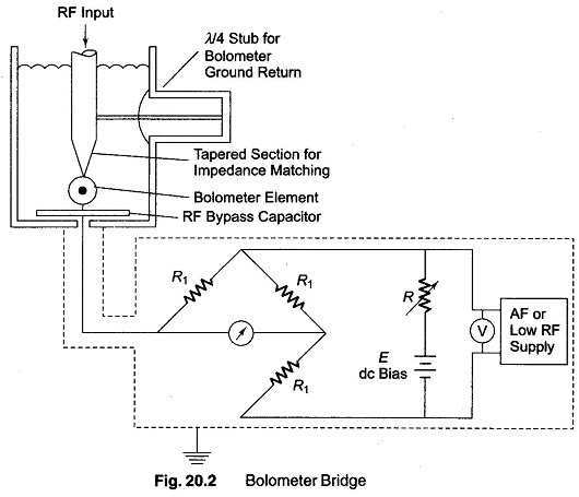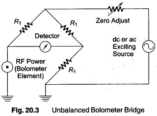 An unbalanced bolometer bridge is shown in Fig. 20.3. In the absence of RF power, the bridge is brought into balance by adjusting the exciting source voltage. The detector now indicates the balance condition of zero. The test RF is now applied to the bolometer element. The resistance of the bolometer changes, and the bridge is unbalanced by an amount indicated by the detector, which gives the magnitude of RF power directly.