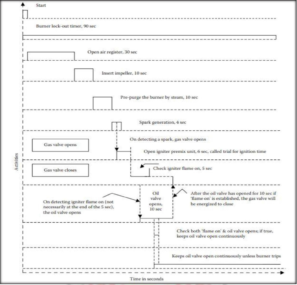 - Timing for a portion of the typical light-off sequence for a 350 MW dual-fired (oil and coal) burner with gas igniter is illustrated in the following figure.