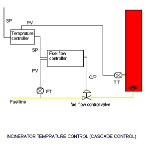 Here burner temperature controller is used as master controller and fuel flow controller is used as slave controller where temperature controller’s out put becomes setpoint of the flow controller and finally out put of flow controller goes on the fuel flow control valve