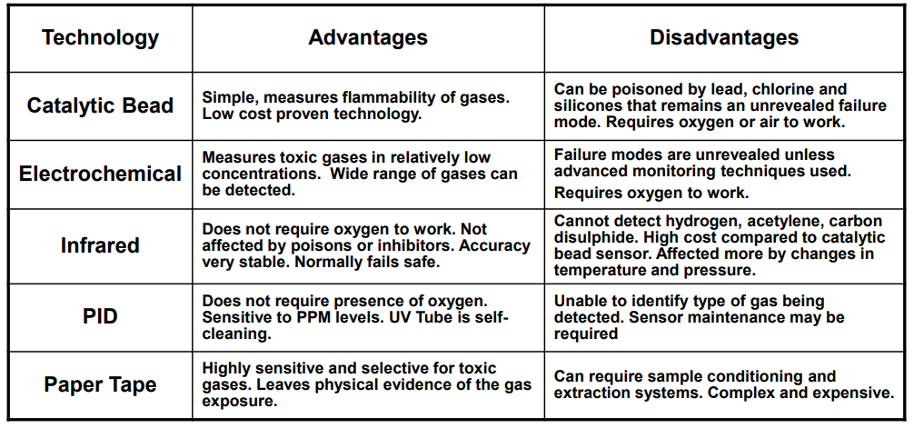 Compare Catalytic Bead, Electrochemical, Infrared, PID and Paper Tape gas detectors.