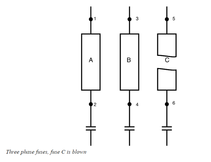 In the diagram above, all three readings give us a line-to-line voltage. To check the condition of the fuses, we measure from the line side of one fuse to the load side of another fuse.