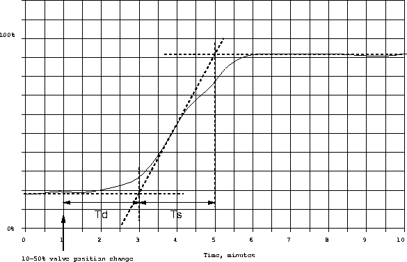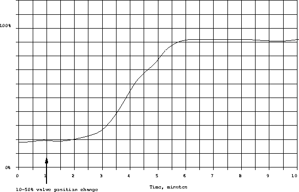 A control room chart record, see the figures below, shows a test on a process in which a control valve was opened from 10% to 50% of its range and the effect on the measurement, to be used in a control loop with the valve, recorded. The top and bottom of the chart represent upper and lower range limits on the measurement.