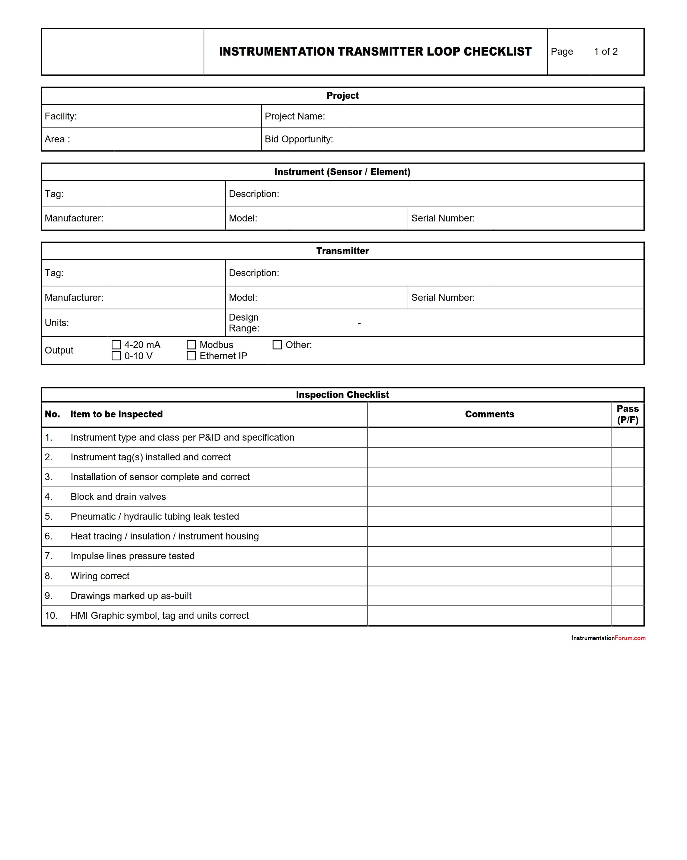 The Instrumentation Transmitter Loop checklist is used to verify the installation of field instruments, configuration, and calibration validation and functional testing.