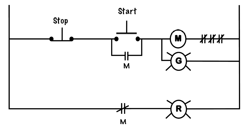 - If the motor starter in the drawing is energized and functioning properly, what should the voltage be across the normally open contact (M)?