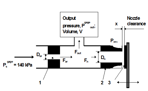The diameter of the supply restriction 1 is 0.2-0.3 mm, whereas that of the nozzle 2 is 0.8 mm. The distance between the flapper 3 and the nozzle determines the output pressure in the chamber between them. This pressure is measured by the pressure gauge 4.
