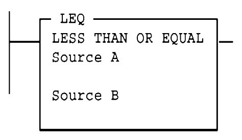 The Less Than or Equal (LEQ) instruction in ladder logics is used to test whether one value (source A) is less than or equal to another (source B).