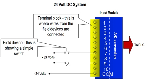 • Output modules take digital signals from the PLC and convert them to electrical signals such as 24VDC and 4 mA that field devices can understand.