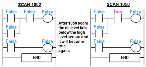 • Step 3-UPDATE OUTPUT STATUS : Finally the PLC updates the status of the outputs. It updates the outputs based on which inputs were on during the first step and the results of executing your program during the second step. Based on the example in step 2 it would now turn on the first output because the first input was on and your program said to turn on the first output when this condition is true. After the third step the PLC goes back to step one and repeats the steps continuously. One scan time is defined as the time it takes to execute the 3 steps listed above.