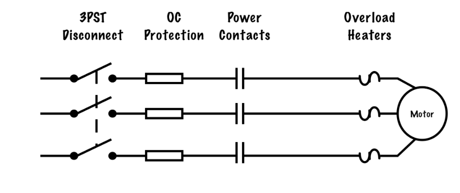In order for the motor to operate, the 3-phase disconnect must be closed, the fuses must be in good working order and the power contacts must be closed. The start and stop action of the motor is determined by the control circuit, which energizes the magnetic motor starter, pulling in or dropping out the armature that then opens or closes the power contacts.