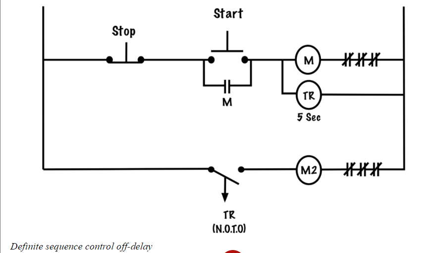 The above switching arrangement will allow two motors to be controlled from a single pushbutton station. If the start button is pressed both motors M1 and M2 will start instantly. This is because the normally open contacts associated with the off-delay coil will change their state instantly when the coil is energized.