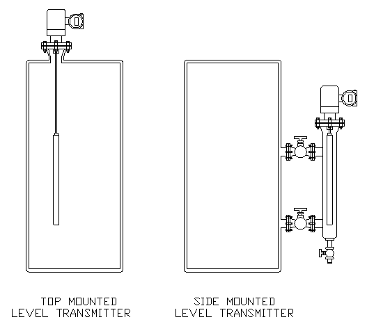 Top mounted means the sensor or measuring element of level instrument is inserted into the vessel or tank from the top. Side mounted with external cage means sensor or measuring element is installed integrally in manufacturer prefabricated external cage.