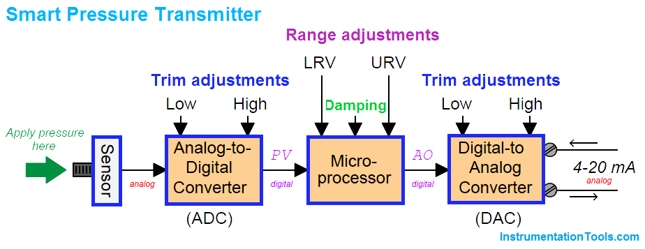 A smart transmitter has a number of other capabilities as well. For instance, inputs can be varied, as denoted by A/D. If a temperature transmitter is a smart transmitter, it will accept millivolt signals from thermocouples, and resistance signals from RTDs and thermistors.