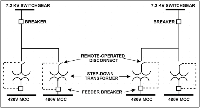 Refer to the simplified drawing of an electrical distribution system showing 7.2 KV switchgear, step-down transformers, and 480 V motor control centers (MCCs) (see figure below).