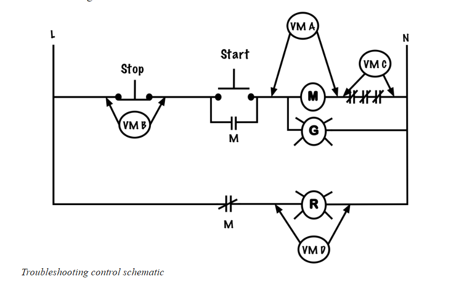 If an overload occurs and the OLR contacts open, voltmeter C will read line voltage while the start button is being pressed, and nothing when it is released.