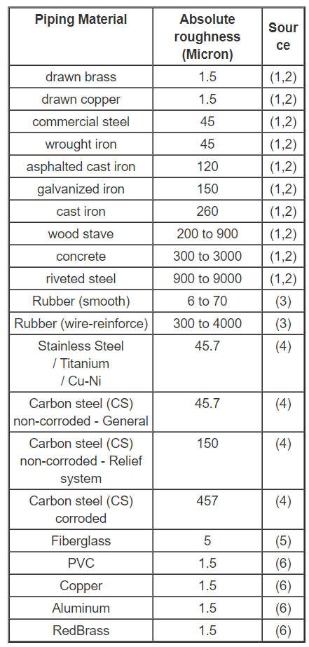Pipe absolute roughness (e) tabulated are taken from from several sources. These values are for new pipes and typically for new design purpose. For aged pipes or debottlenecking purpose, higher roughness are expected.