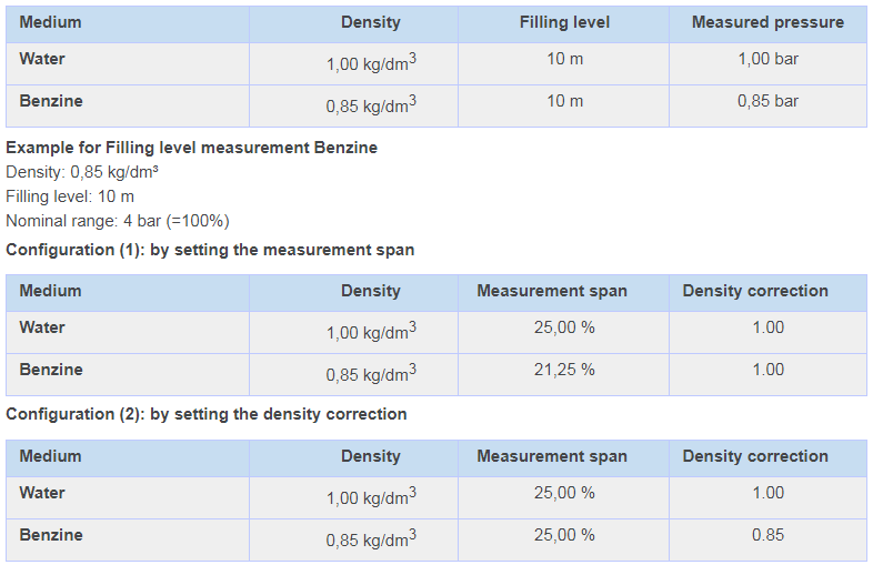 For measuring the filling level of liquids with a density that is other than 1.0 kg/dm³ (i.e. not the same as water).