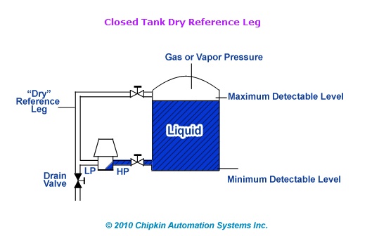 It is recommended to maintain a dry reference leg since buildup of condensate or other fluids have tendency to introduce errors in the level measurement results. A typical closed tank dry reference leg is shown in the figure below.