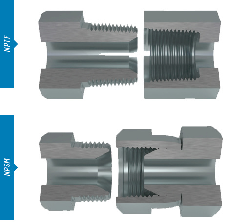 NPSM (National Pipe Straight Mechanical) connections are also often found in fluid power systems. The female component incorporates a straight thread with an inverted 30° seat. The male component has a straight thread and a 30° internal chamfer.