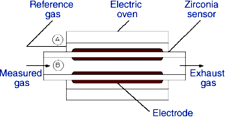 In Fig., a gas with fixed oxygen concentration (normally air) is placed on the A side as the reference gas (PR), while the gas whose oxygen concentration is to be measured (PM) is placed on the B side. When this is done, ion conduction occurs from the side with higher oxygen concentration to the side with lower oxygen concentration. This generates an voltage (emf) which is proportional to measured oxygen gas concentration.